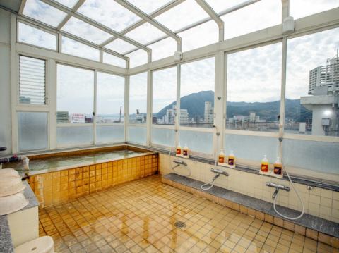 源泉掛け流しの展望風呂は別府湾と高崎山を一望。男性風呂は「檜湯」となっております。